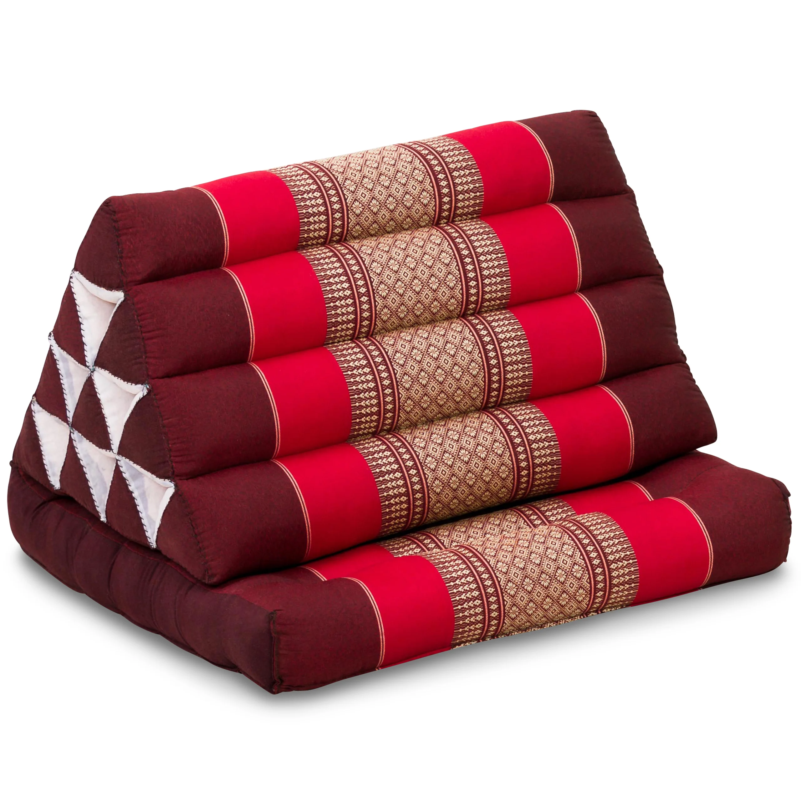 Omsorgsfullt utarbetade mönster i klassisk design från Fjärran Östern fångar blicken och passar i alla rum. De handgjorda triangelkuddarna med liggdel kan lätt fällas ihop när de inte behövs. Kärnan bildas av det fantastiska dunet kapok och kudden charmar med sina robusta egenskaper. Den kommer att hålla dig och dina sköna stunder sällskap i många år.